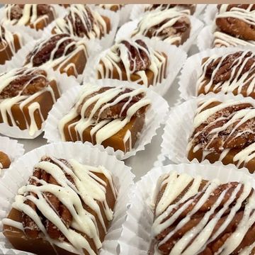3 pieces of our Original buttery Homemade Gourmet Caramel Bite topped with white chocolate, pecan and sugar cinnamon